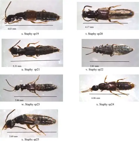 Rove beetles are usually found around decaying animal and vegetable matter, preying on carrion-feeding insects. Most of them are slender and small (usually less than 3 mm, or 1/8 inch); the largest species, such as the devil’s coachhorse (Staphylinus olens), are usually no more than 25 mm (1 inch). The short, thick elytra protect the second, fully developed pair of flying wings.
